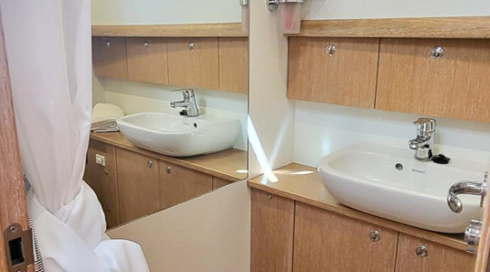 La coberta inferior, de sostres alts, presenta una distribució inicial de tres cabines dobles, dos banys complets i una cuina totalment equipada.