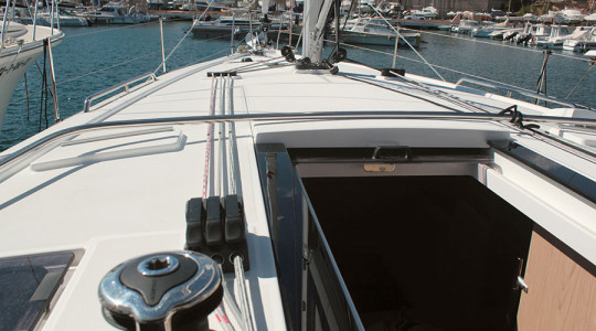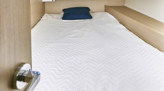 Amb 2 cabines, 1 bany, vela major clàssica i gènova enrotllable, aquest model destaca per la seva bona habitabilitat interior, disseny modern i espais exteriors funcionals. La banyera i la plataforma de bany estan revestides en teka, i la seva configuració inclou doble roda de timó, bimini, electrònica B&G i propulsor de proa per a més comoditat a bord.