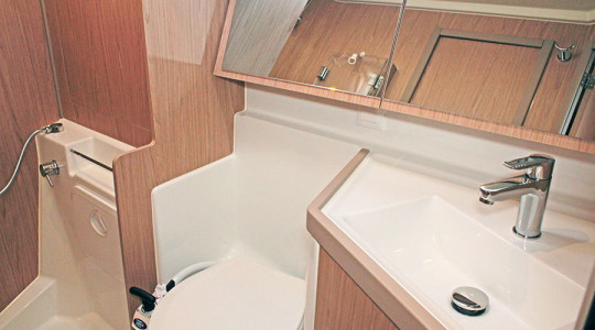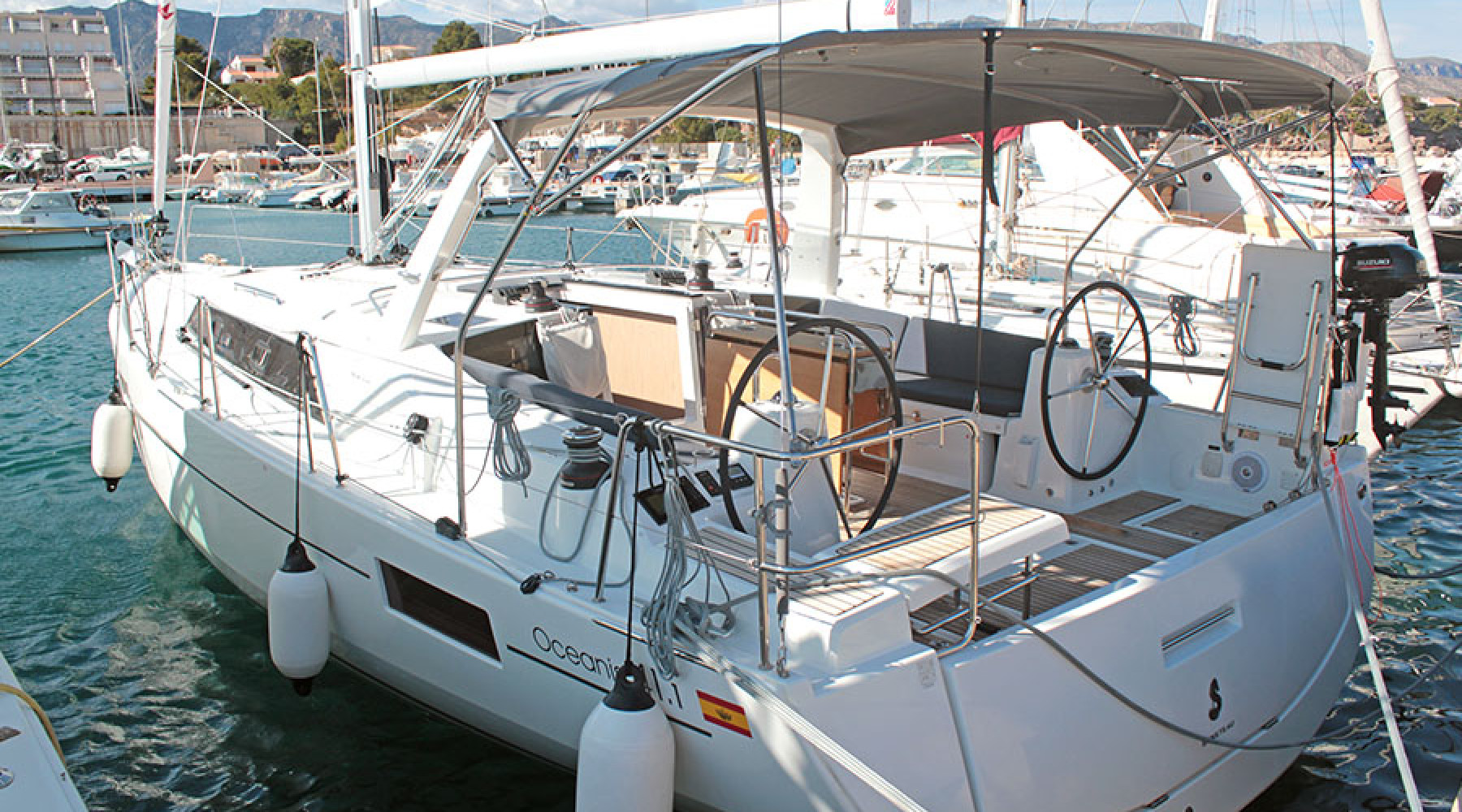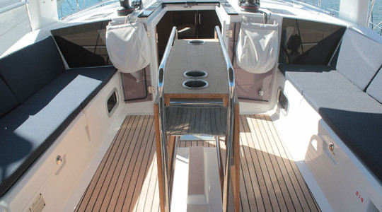 Compta amb una configuració de 3 cabines i 2 banys, i està equipat amb múltiples extres per garantir comoditat a bord i maniobra fàcil: vela major enrotllable, hèlix de proa, WC elèctric, plataforma de bany amb obertura elèctrica, dipòsit d’aigua suplementari, sòl de banyera en teka, llit convertible al saló i sistema AIS.