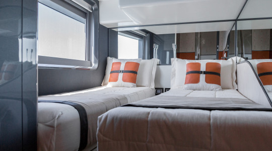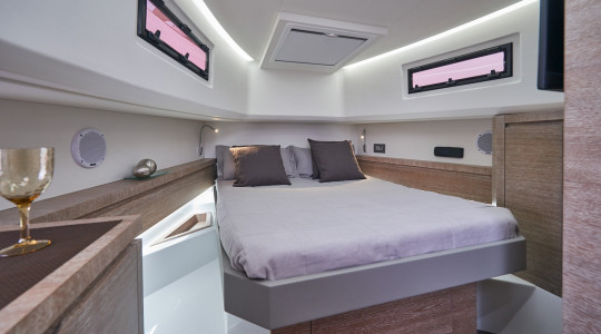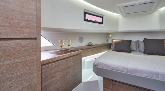 The originality of the Coupe lies in details such as the inverted bow, the aluminium structure of the cabins, the all-carbon construction of some of the parts and the stepped design of the stern, a distinctive feature of the big boats.
