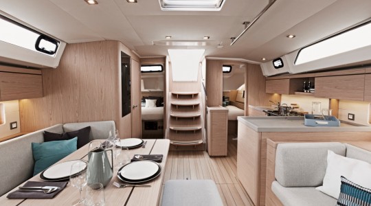 Contemporary style, open and well lit with natural light, the interior of this 44-footer is presented with a combination of white lacquer, moulded wood and quality, resistant upholstery.