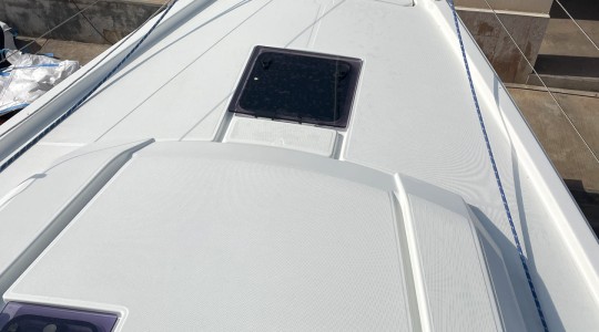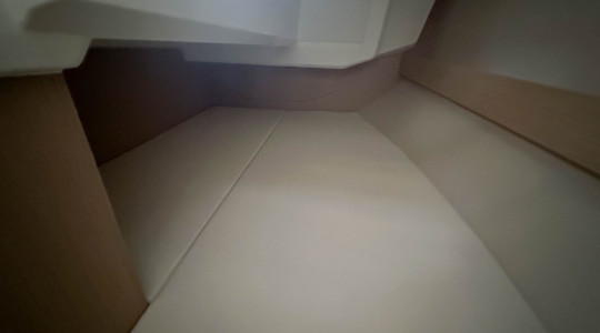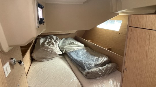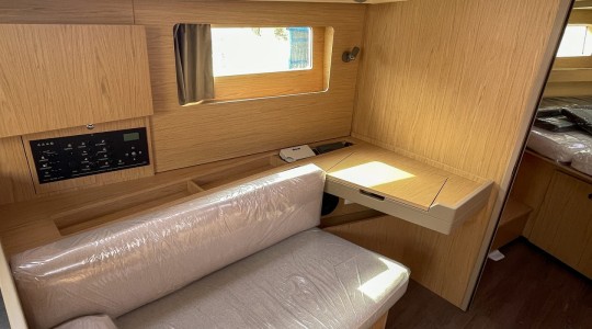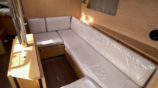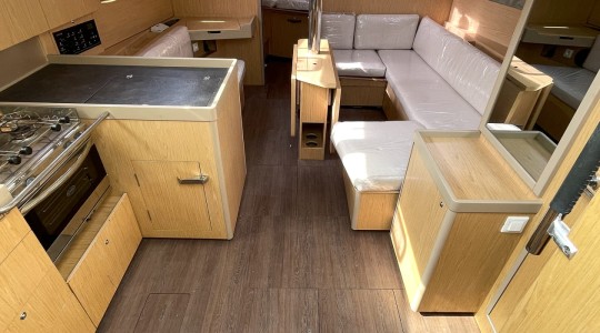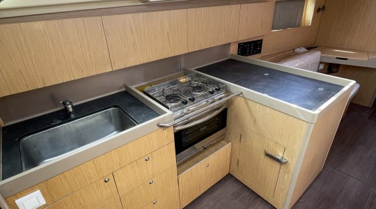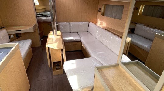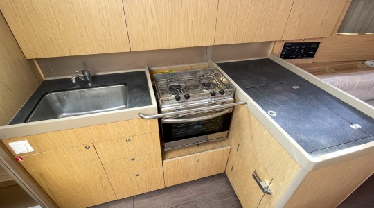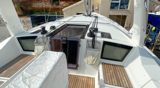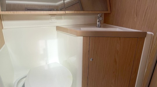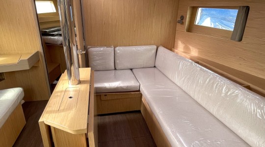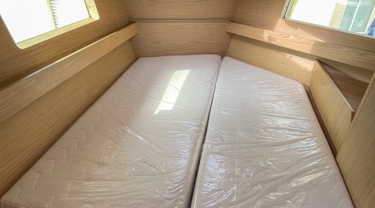 The interiors offer a height of 1.98 m, which allows you to circulate comfortably without having to bend down at any time. Its layout consists of 2 double cabins, a separate sink and shower to make life on board easier, a living room where the sofas can become two extra bunks and an L-shaped galley consisting of a 75-litre fridge, stove, oven and ample storage space.