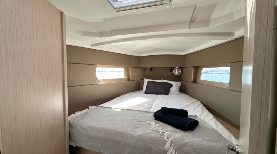 The stern of the boat is super cozy. The regular version has a large bed and has another large space for sails storage from both, inside and outside.