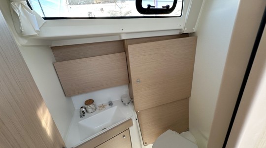 The bow cabin provides wonderful views of the sea through 2 large windows. In the version with two bathrooms, the bed is next to the right wall and is also a good size.