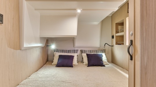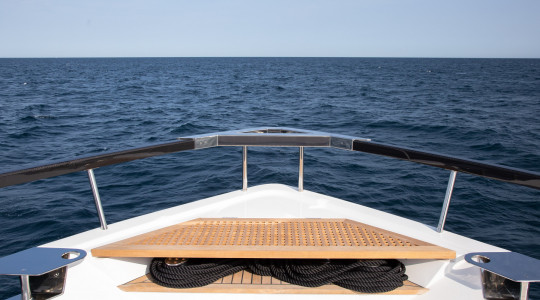 In the cockpit, a transverse bench and a folding table form an outdoor lounge. The stern is completed by the bathing platform, which can optionally be hydraulic. At the bow, a large sundeck with easy and comfortable access becomes a perfect area for disconnecting.