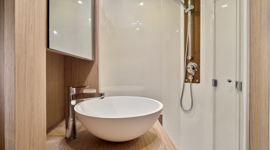 On the lower deck there are 3 double cabins with 2 en-suite bathrooms. The owner's cabin has an ensuite bathroom, while the guest cabins share a full bathroom. In addition, a washer/dryer can be installed in the starboard cabin's wardrobe.