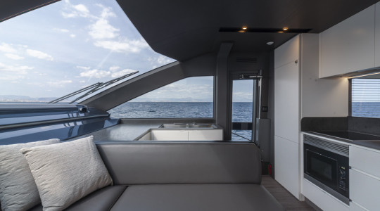 Both the access stairs to the flybridge and the flybridge itself have high handrails to ensure greater safety. With 20 m2 of surface area, the flybridge area offers a very good configuration option to be valued. The two sofas that make up the dining area surround the helm station, fully integrating the pilot with the common areas. This ample recreational space is completed with a service unit that can be used as a galley or bar.
