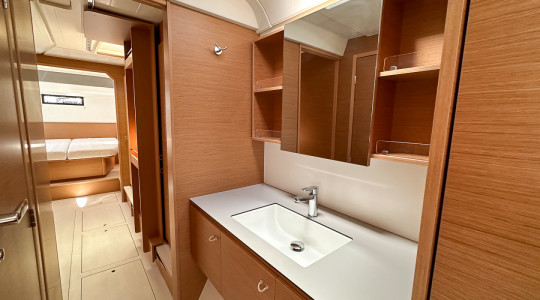 There are two versions: one with three cabins and one with four, accommodating six to twelve overnight guests. The owners' hull combines a spacious cabin with a large bathroom in the bow and, a rare feature for a boat of this size, a large wardrobe suitable for long stays, different activities, and varied climates. It also includes an ergonomically designed desk area with natural light. In addition to the chart table, it offers a second workspace, allowing professional life to blend with a passion for the sea.