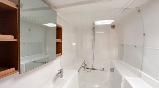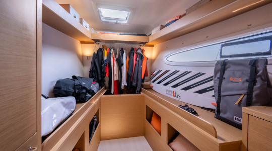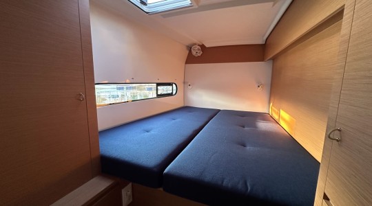 In this 45-foot sailing catamaran you have the option to choose between the configurations of 3 cabins and 3 bathrooms or 4 cabins and 4 bathrooms, both with the shower separated from the bathroom, highlighting the transformer option that converts the dressing room from the owner's cabin in a cabin with two single beds.