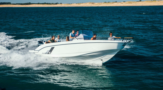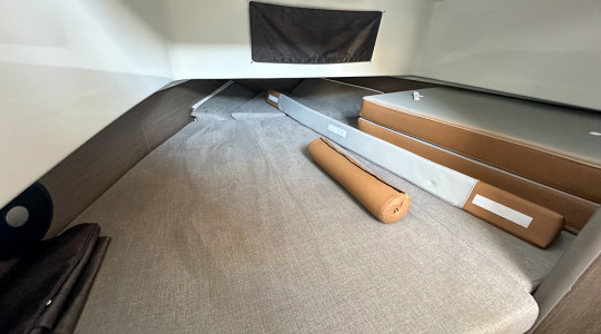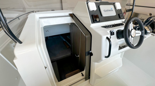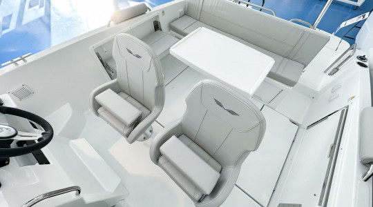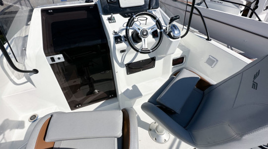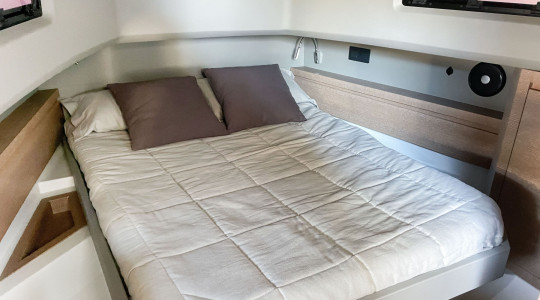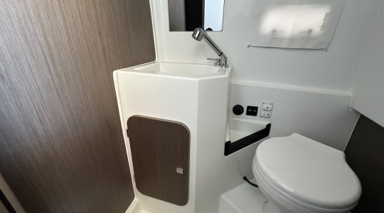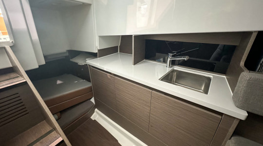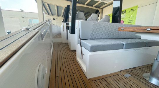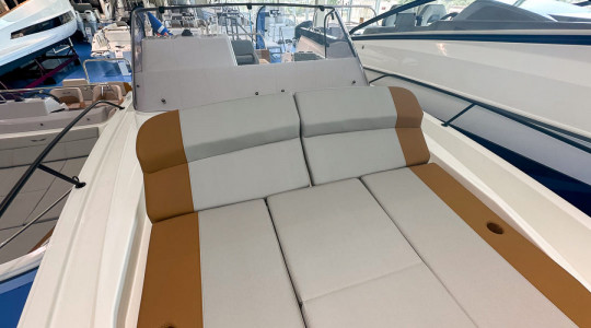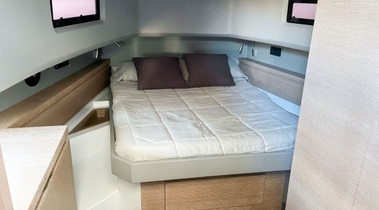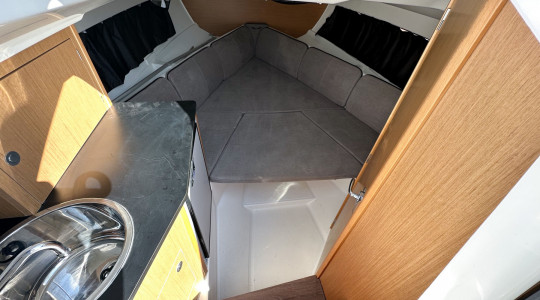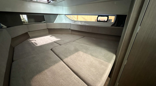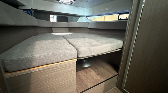 With its sleek profile, generous exterior spaces, and well-thought-out interior layout, it offers comfort for both day outings and weekend getaways. It features a main cabin with a double bed, bathroom with separate shower, and an additional aft area for storage or relaxation, all finished in natural oak and stylish grey upholstery.