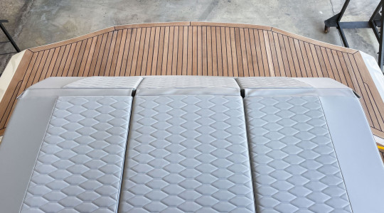 On deck, it stands out with a spacious sunbathing area, swim platform, outdoor cooking space, aft shower, and a triple helm seat with Silvertex upholstery. This unit includes upgrades such as teak decking in the cockpit and platform, a hardtop with LED lighting, electric anchoring system, and joystick control, as well as the latest Volvo electronics.