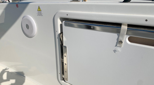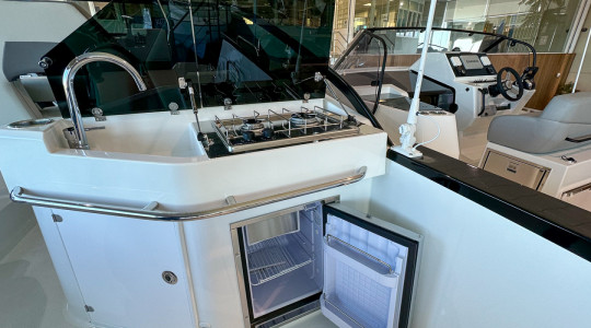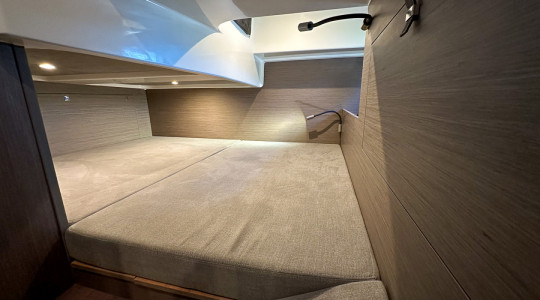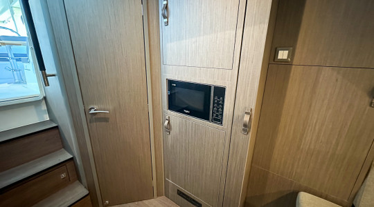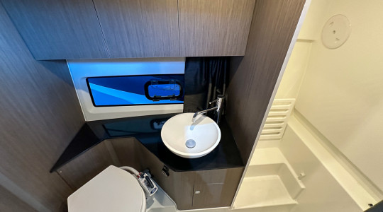 It comes equipped with two fridges, a galley with sink, external hob, shower, toilet with integrated walls, bow thruster, electric windlass, and Zipwake automatic trim system, along with LED courtesy lighting, Fusion sound system, and Garmin electronics.