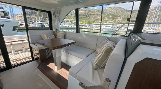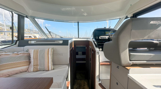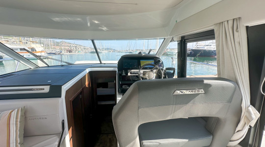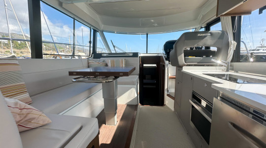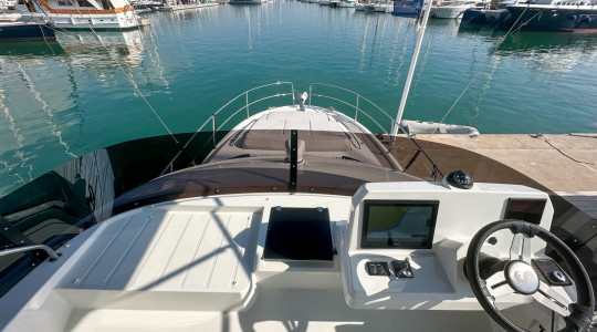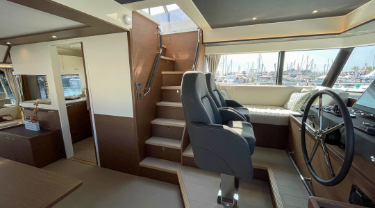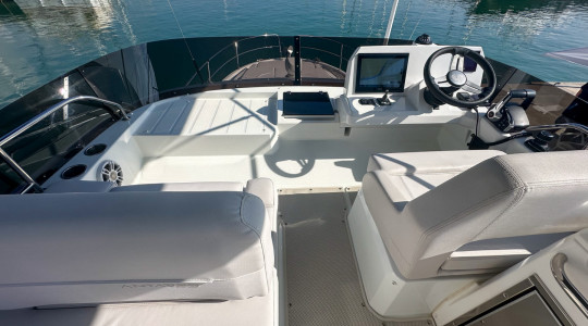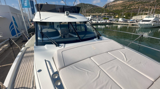 El flybridge: espacioso y protegido por un estiloso hard top, consta de un mueble bar y cocina, una zona de dinette con una gran mesa y un amplio sofá en forma de U, además de una zona pensada para la relajación con un solárium para 3 personas. Todo ello bien distribuido y coronado por el puesto de mando compuesto por dos asientos individuales delante de la consola y un cómodo lounge para poder disfrutar en buena compañía de la navegación.