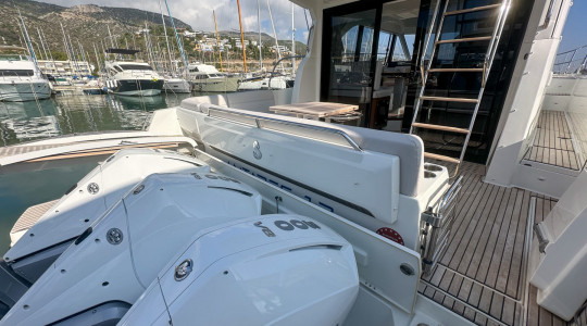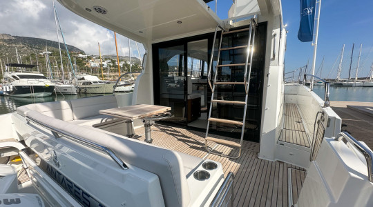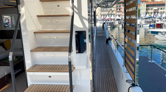 Destacan los tres solariums distribuidos en proa, popa y flybridge que se convierten en la declaración de intenciones de este yate, enfocado al ocio confortable. Unas cómodas escaleras acompañadas de un pasamanos, garantizan la seguridad de acceso al flybridge, la zona donde poder disfrutar de la embarcación con un alto nivel de privacidad.