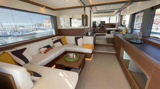 La gran entrada de luz que proporcionan los amplios ventanales aligera la embarcación y regala un ambiente acogedor y luminoso. Siguiendo las líneas del elegante diseño Astondoa, el salón permite sentirse completamente conectado al mar gracias a sus amplias y sorprendentes vistas.