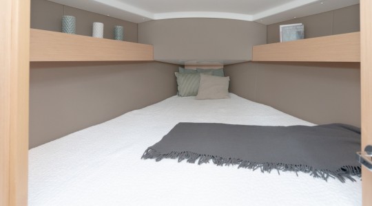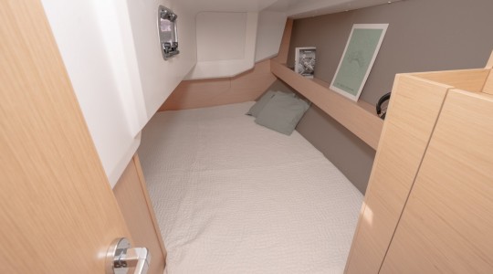 Los interiores ofrecen una altura de 1,98 m cosa que permite circular cómodamente sin tener que agacharse en ningún momento. Su distribución consta de 2 camarotes dobles, un lavabo y una ducha separados para facilitar la vida a bordo, un salón donde los sofás pueden convertirse en dos literas extra y una cocina en forma de L compuesta por una nevera de 75 litros, fuegos, horno y amplio espacio de almacenaje.