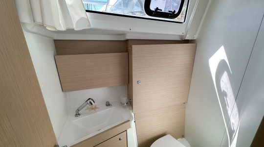 Destaca la combinación de madera, tejidos nobles y superficies lacadas en una sutil armonía. Un elegante equilibrio que presenta un trabajo impecable en las maderas. Además, gracias al amplio casco, este CNB 78 puede acomodar cabinas de invitados con las mismas dimensiones que la cabina del armador.