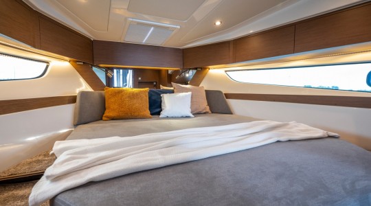 La cabine principale, située à l’avant, garantit des nuits confortables en mer. Avec un lit queen-size, des meubles laqués, un éclairage d’ambiance, une tête de lit rembourrée et une grande armoire, elle offre un niveau de confort et d’élégance exceptionnellement rare pour des bateaux de cette taille.