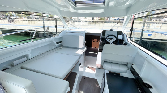 Cette arche s’intègre au grand toit de la cabine, qui protège le spacieux cockpit arrière de 1,7 m sur 2,4 m. En ajoutant un siège supplémentaire, le salon en L peut être transformé en une disposition en U, idéale pour accueillir de nombreux invités. Ce salon modulable peut facilement se convertir en espace bain de soleil, parfait pour se détendre et profiter du beau temps.