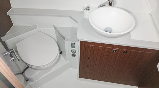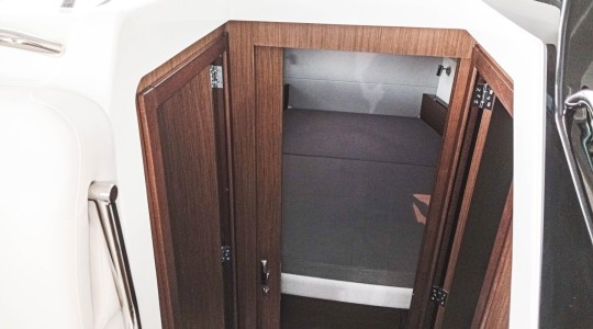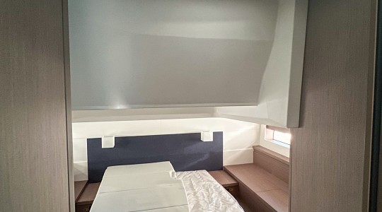 Au pont inférieur, tout le confort est prévu pour prolonger l’escapade en mer : une très belle cabine propriétaire à l’arrière avec sa salle d’eau indépendante, une cabine invitée à la proue avec une seconde salle d’eau, un carré convivial et une grande cuisine équipée. L’atmosphère élégante et chaleureuse offerte par le bois noyer gris caractérise la nouvelle génération d’Express-Cruisers.
