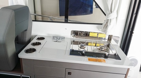 Dans le cockpit, nous trouvons une grande dinette en forme de U qui entoure une grande table en bois pliante, ainsi qu'un coin cuisine avec un évier et la possibilité d'un réfrigérateur et d'un grill. Grâce au hard-top doté d’un toit ouvrant électrique de série (en verre, en option) et la possibilité d’une baie vitrée escamotable pour fermer l’arrière du cockpit, le GT 45 favorise l’ouverture sur les éléments naturels tout étant protecteur dès que les conditions l’exigent.