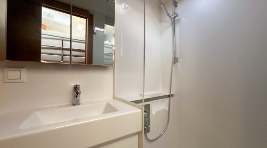 Dans ce catamaran à voile de 45 pieds vous avez la possibilité de choisir entre les configurations de 3 cabines et 3 salles de bain ou 4 cabines et 4 salles de bain, les deux avec douche séparée de la salle de bain. Avec l’option transformer on peut même transformer le dressing de la cabine du propriétaire dans une cabine additionnelle avec deux lits individuels.