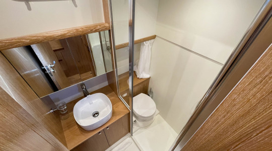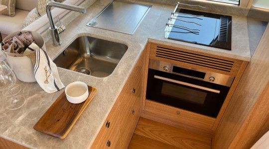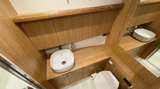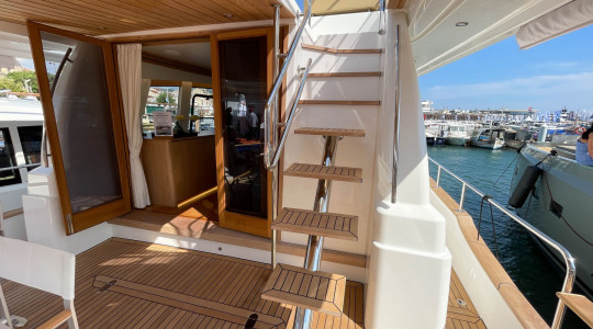 Tous les espaces extérieurs de ce 54 piés sont très étendus : avec un grand solarium où on peut intégrer une salle à manger, la grande plateforme de bain et le grand solarium de proue avec sofa pour profiter de la vie à bord en compagnie.