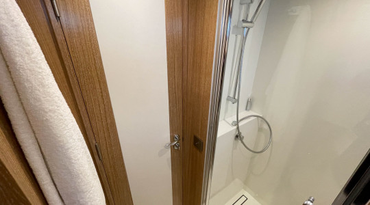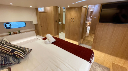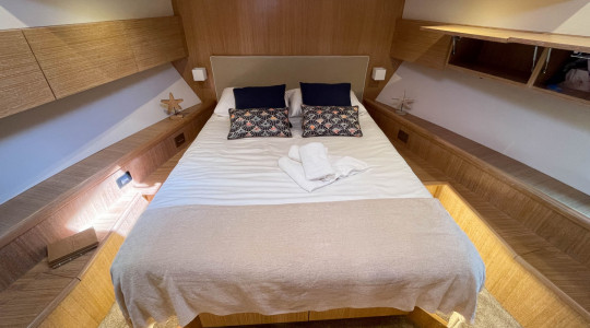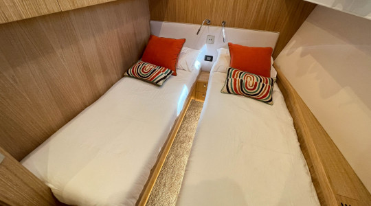 Les tons clairs prédominent, avec des finitions en bois de chêne décapé blanc et un capitonnage blanc cassé. Le pont inférieur, avec de hauts plafonds, est organisé en trois cabines doubles, deux salles de bain complètes et une cuisine complètement équipée.