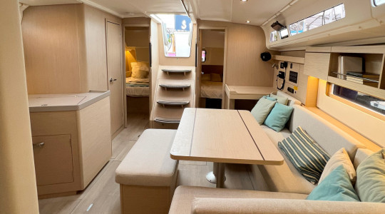 Avec 3 cabines, 1 salle d’eau et un aménagement intérieur fonctionnel, cette unité comprend une grand-voile et un génois enroulables, une sellerie moderne, un éclairage LED, un volume intérieur généreux et de nombreuses solutions pensées pour la vie à bord. Le cockpit et la plateforme de bain sont habillés en IRO-DECK, alliant élégance et durabilité sur le pont.